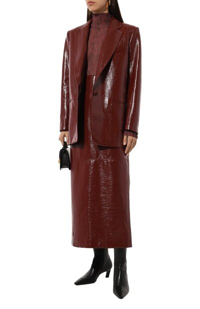 Силуэт черных ботильонов на невысоком изогнутом каблуке с зауженным мысом подчеркнуто лаконичен. Для создания пары использовали гладкую эластичную кожу наппа, отполированную до мягкого блеска. Роль единственного, деликатно сияющего акцента играет металлический пуллер с выгравированным логотипом.