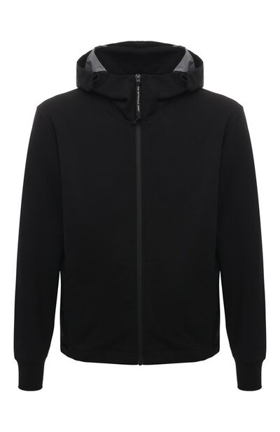 Черная толстовка из коллекции Metropolis получилась функциональнее аналогов за счет множества карманов: двух внутренних и четырех внешних по бокам (пары на молниях и пары с клапанами). Для пошива модели с регулируемым капюшоном использовали сочетание мягкого эластичного футера и двуслойной ткани пертекс с дышащей мембраной, защищающей от влаги.
