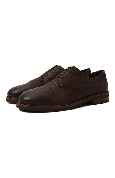 Для создания темно-коричневых дерби использовали мягкую и эластичную оленью кожу с выразительной зернистой фактурой. На поверхность готового изделия мастера итальянской марки слой за слоем нанесли краски разных полутонов, чтобы получить легкую патину. Со временем она будет проявляться все более отчетливо и придаст паре уникальный вид.