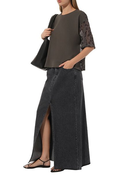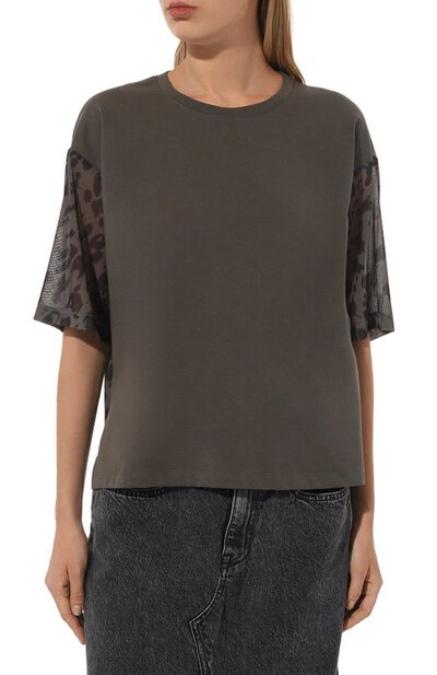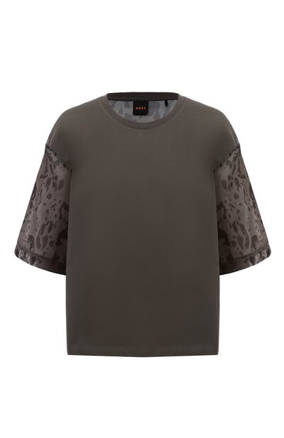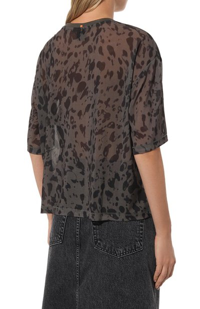 Серую свободную футболку с леопардовым мотивом мастера марки, основанной Хуго Фердинандом Боссом, сшили из легкой эластичной сетки, которая идеально пропускает воздух и не мнется. Провокационность модели из такого полупрозрачного материала снижает передняя часть, выполненная из мягкого хлопкового джерси.