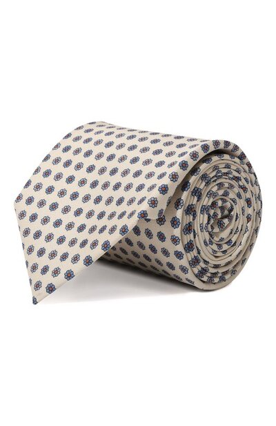 Широкий кремовый галстук выполнен вручную из цельного отреза фактурного шелка с фуляровыми цветочными узорами. Пластичный аксессуар хорошо держит форму, почти не мнется и быстро восстанавливается после развязывания. Длины изделия хватит, чтобы сформировать сложный объемный узел.