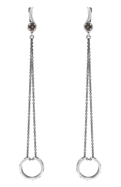 Серьги с итальянской застежкой выполнили из серебра 925-й пробы. Миниатюрное основание, инкрустированное круглым коричневым раухтопазом, дополнили тонкой двойной цепочкой, дополненной кольцом с выгравированным узором.