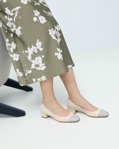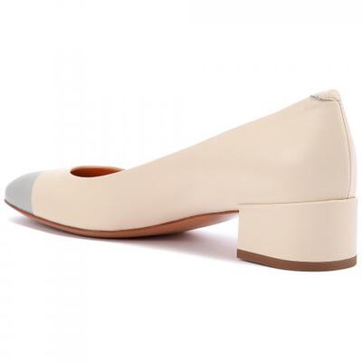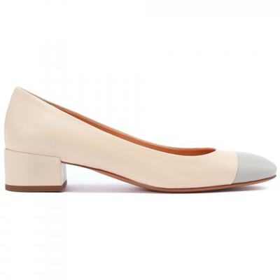 Туфли-лодочки из натуральной бежевой кожи от Principe di Bologna. Лодочки в бежевом цвете – классическое дополнение женского гардероба. Акцентом дизайна служит контрастный носок серого цвета, придающий модели оригинальный штрих. А благодаря широкому устойчивому каблуку высотой 40 мм. в этой паре можно ходить целый день - идеально для офисного дресс-кода.