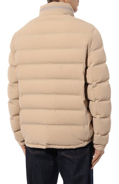 Стеганую куртку с герметичными термосварными швами сшили из легкого нейлона с водоотталкивающим покрытием. Модель на гусином пуху дополнили боковыми карманами с молниями и двумя внутренними, а в воротнике-стойке спрятали тонкий капюшон.
