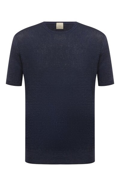 Темно-синий джемпер с короткими рукавами напоминает футболку. Для изготовления модели использовали тонкую пряжу из легкого прочного льна с характерным неравномерным оттенком. Изделие из такого дышащего материала быстро отводит влагу, не впитывает запахи и поддерживает оптимальную терморегуляцию.