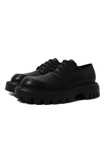 Градус формальности черных дерби Маттиа Капеццани снизил при помощи круглого объемного мыса и широкой протекторной подошвы, как у трекинговой обуви. Для изготовления модели с рельефным логотипом на выступающей пятке использовали гладкую мягкую кожу с деликатным блеском.