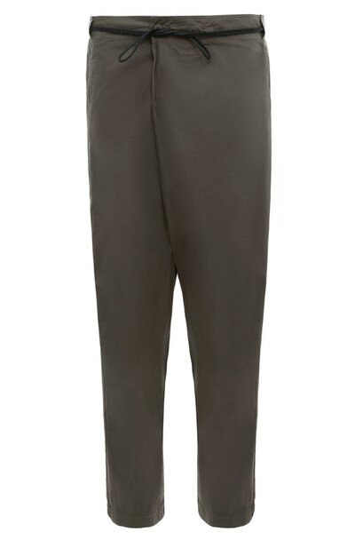 Темно-серые брюки с заниженной линией шага – идеальная основа непринужденного повседневного образа. Для пошива модели использовали тонкую хлопковую ткань, которая хорошо пропускает воздух и почти не мнется. В шлевки на поясе продели толстый шнур, заменяющий ремень.