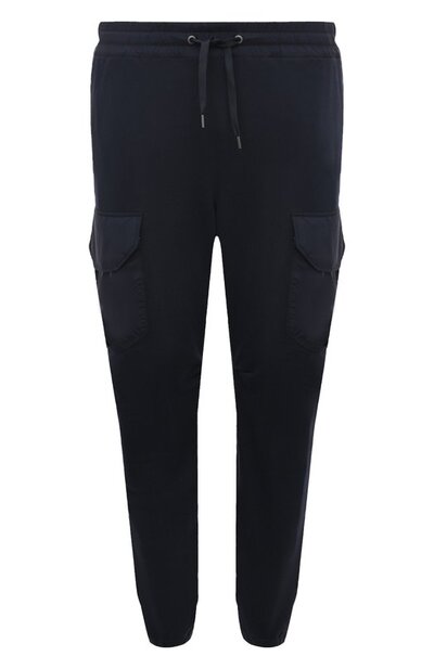 Для пошива чернильно-синих джоггеров использовали мягкий хлопковый трикотаж с фактурной изнанкой, хорошо сохраняющей тепло. Модель дополнили накладными карманами, как у карго, выполненными из шелковистой прочной тафты, и кулиской на поясе, регулирующей посадку на талии. Сбоку брюки украсили патчем с вышитой эмблемой, деликатно обозначив принадлежность бренду.