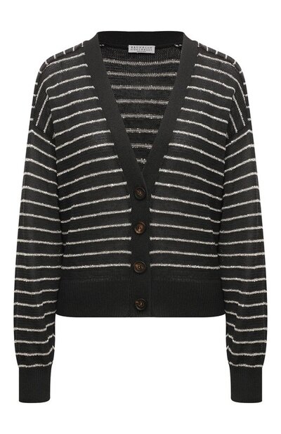 Свободный кардиган связали из длинноволокнистого хлопка премиальных сортов. Пряжу цвета графита чередовали с серебристыми нитями, в которые вплели мелкие пайетки, деликатно переливающиеся в ответ на каждое движение. В повседневном образе полосатая модель с глубоким вырезом подружится с брюками, сандалиями и сумкой.
