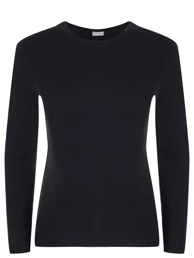 -Модель облегающего силуэта с длинными рукавами и круглым вырезом на груди.