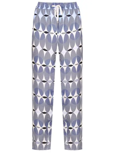 -Укороченные брюки из шелка с принтом от LORENA ANTONIAZZI. -Модель зауженного к низу кроя длины 7/8 с эластичным поясом на кулиске для выбора комфортной высоты посадки, высокой линией талии, прорезными карманами.