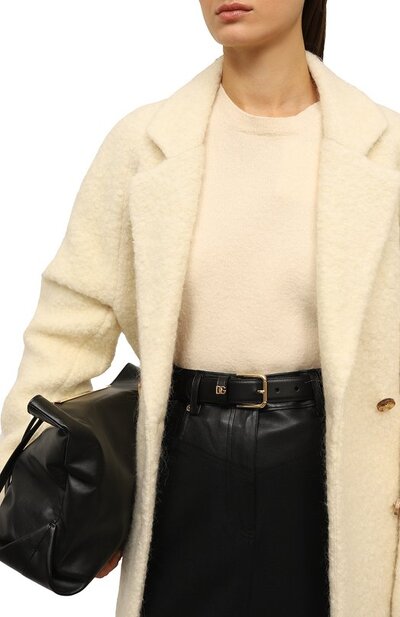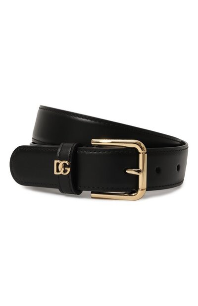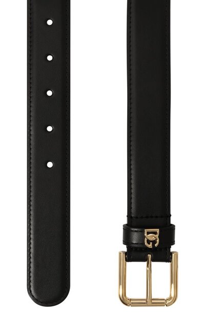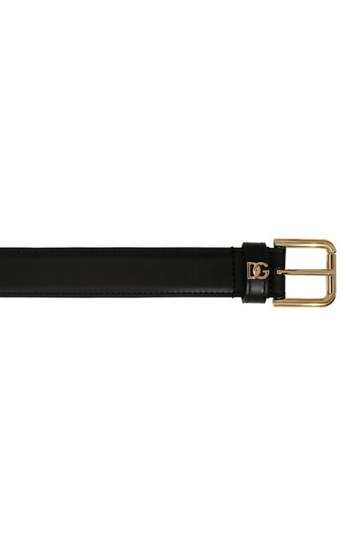 Для изготовления черного ремня использовали прочную кожу с гладкой матовой поверхностью. Аксессуар регулируется по длине прямоугольной пряжкой из золотистого полированного металла. Из этого же материала выполнена монограмма DG, украсившая шлевку.
