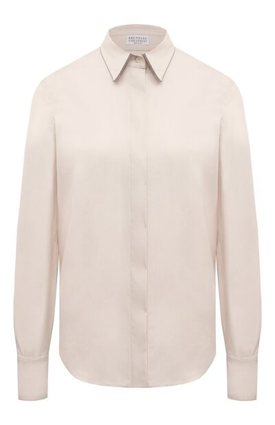 Прямая рубашка кремового оттенка станет удачной альтернативой привычной белой в деловых образах и повседневном гардеробе. Индивидуальный штрих лаконичному изделию добавляют узкая планка, скрывающая пуговицы, и сияющая цепочка мониль по контуру отложного воротника. Для пошива использовали тонкий хлопковый поплин, который почти не мнется и хорошо тянется за счет эластичных нитей в составе.