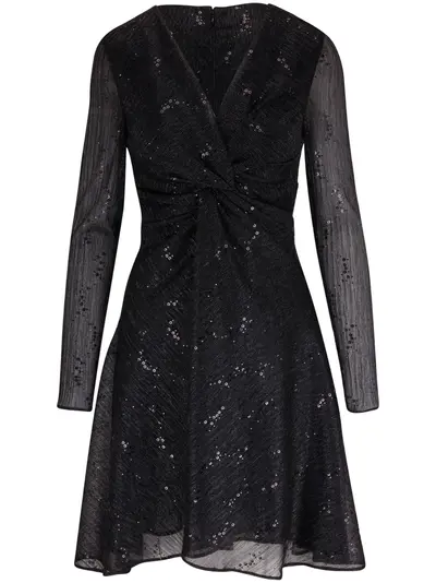 black sequin embellishment semi-sheer construction long sheer sleeves V-neck knot detailing flared skirt