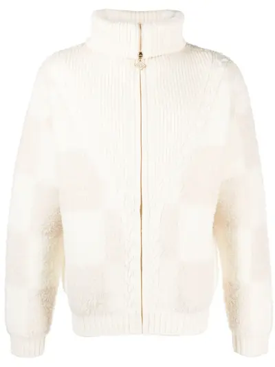 light beige wool blend bouclé construction check pattern gold-tone hardware roll neck front zip fastening long sleeves straight hem