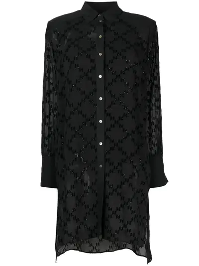 black recycled polyester glitter detailing monogram jacquard classic collar long sleeves buttoned cuffs front button fastening straight hem