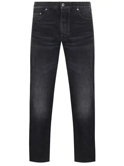 -Серые джинсы из выбеленного хлопка с декоративными заломами от OFF-WHITE. -Модель со стандартной посадкой, поясом со шлевками, прорезными и накладными карманами, застежкой на пуговицы, кожаной нашивкой с тисненым логотипом бренда.