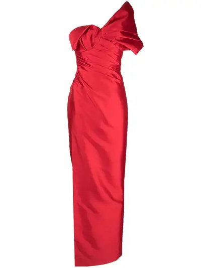 bright red wool-silk blend bodycon design draped and ruched detailing one-shoulder concealed rear zip fastening floor-length