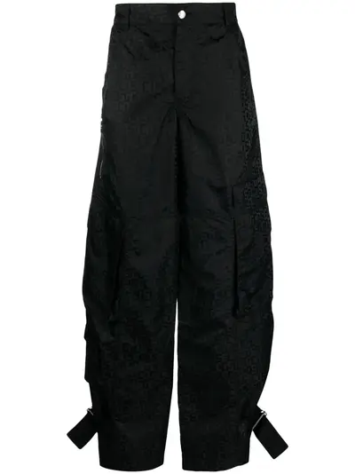 black monogram pattern branded zip puller decorative zip detailing belt loops wide leg button fly fastening multiple cargo pockets two rear flap pockets