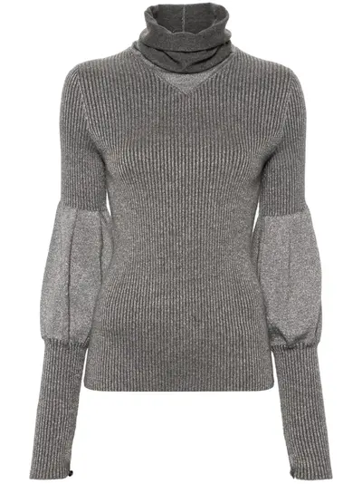 circa 2005 silver cotton-cashmere blend knitted construction ribbed knit metallic threading roll neck long puff sleeves This item contains at least 50% materials which are certified or widely recognised as having a lower environmental impact through production and/or manufacturing processes that reduce water consumption and the use of harmful chemicals, or re-use by-products of the production process. Purchasing this item continues its narrative and reduces the environmental impact by avoiding the use of new resources needed to make the product from scratch, such as water, materials and electricity, and avoiding additional manufacturing impact. Learn more about what makes a product Conscious on our Conscious Criteria page