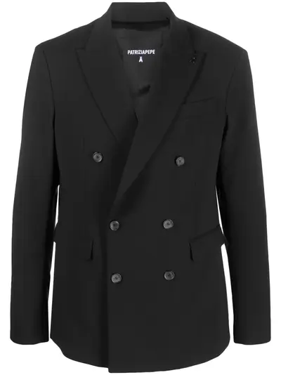 black tonal logo plaque peak lapels double-breasted button fastening long sleeves buttoned cuffs chest welt pocket two front flap pockets American rear vent straight hem