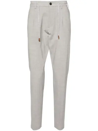 heather grey stretch-wool slub texture mid-rise belt loops inverted pleat elasticated waistband with internal drawstring front button and zip fastening two side inset pockets two rear button-fastening pockets tapered leg