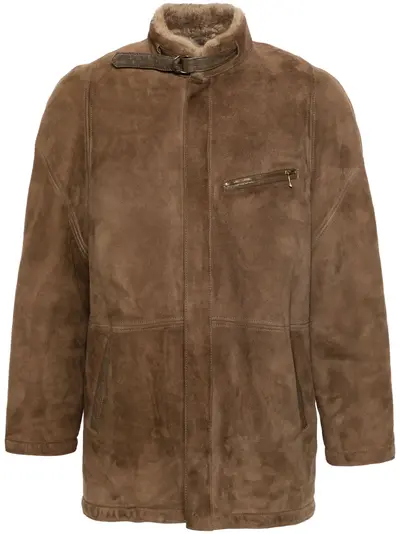 circa 1980s tobacco brown sheepskin suede panelled design high neck throat latch concealed front zip fastening drop shoulder long sleeves zip-fastening chest pocket two diagonal pockets to the sides shearling lining straight hem Condition: GOOD. This previously owned and used item is in good condition with minimal signs of use. This may include fading of material or plating and scratches.