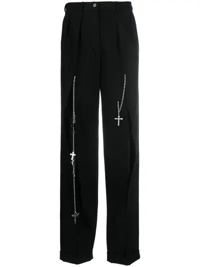 black cotton-cashmere blend cut-out detailing chain-link detailing cross pendant pressed crease straight leg mid-rise belt loops front button and zip fastening two side inset pockets two rear button-fastening jetted pockets turn-up hem
