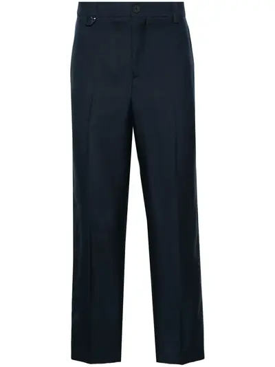 navy blue stretch-cotton tailored design pressed crease belt loops front button and zip fastening tapered leg two side slit pockets two rear button-fastening jetted pockets straight hem ankle-length