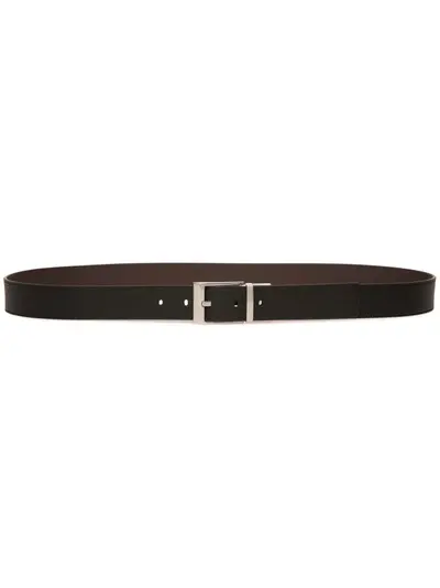 black/chocolate brown calf leather pebbled texture engraved logo silver-tone buckle fastening punched holes