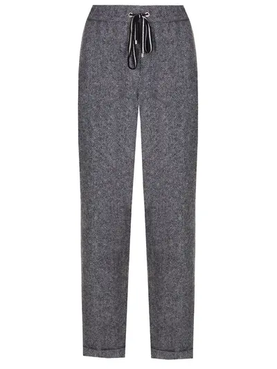 -Серые брюки из смесовой шерсти с узором "елочка" от LORENA ANTONIAZZI. -Модель полуприлегающего силуэта с эластичным поясом на кулиске для выбора комфортной высоты посадки, прорезными карманами и отворотами в нижней части брючин.