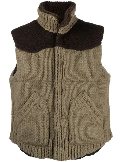 beige/brown wool tricot knit padded design high neck concealed front fastening sleeveless two front patch pockets