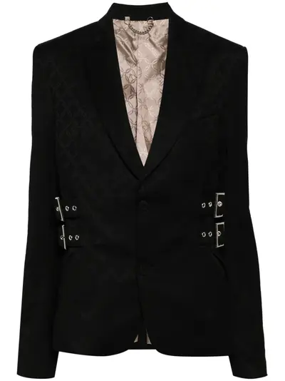 black geometric print peak lapels front button fastening jetted chest pocket side buckle fastening long sleeves buttoned cuffs central rear vent straight hem