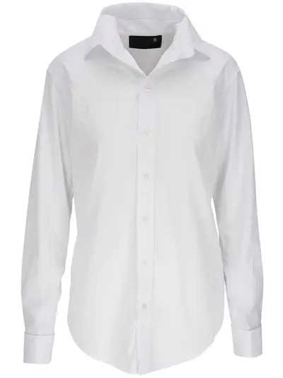 optical white tonal stitching classic collar front button fastening long sleeves buttoned cuffs curved hem