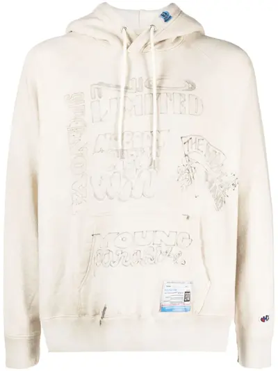 white cotton jersey texture distressed effect ripped detailing logo patch to the front slogan print to the front logo patch at the sleeve logo print to the rear graphic print to the rear decorative collar to the rear drawstring hood long raglan sleeves elasticated cuffs front pouch pocket elasticated hem
