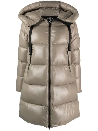 beige high-shine finish logo patch at the sleeve padded design quilted drawstring hood funnel neck front zip fastening long sleeves two side zip-fastening pockets straight hem