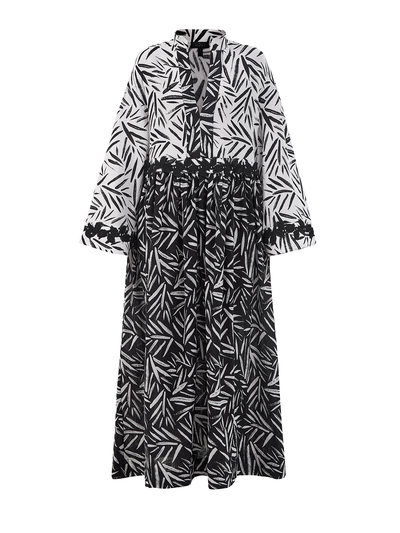 Платье расслабленного кроя oversize от Re Vera выполнено из дышащей хлопковой ткани — тонкая ткань со струящейся фактурой подчеркивает свободный удлиненный силуэт. Модель дополнена графическим черно-белым принтом с флористическим мотивом, пояс и манжеты украшены минималистичной вышивкой ручной работы. Детали: прорезные карманы, V-образный вырез, свободные рукава.