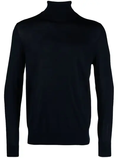 navy blue merino wool-silk blend fine knit ribbed trim roll neck long sleeves straight hem