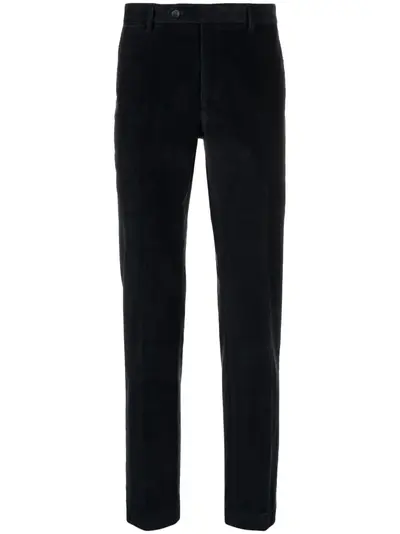 navy blue stretch-cotton corduroy belt loops pressed crease mini logo tag to the rear concealed front fastening slim cut two side slit pockets two rear button-fastening jetted pockets