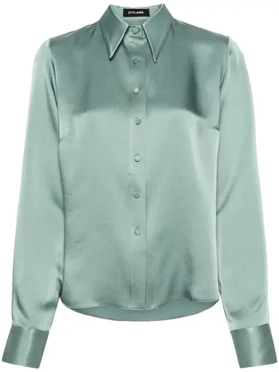 green satin finish pointed flat collar long sleeves buttoned cuffs pointed collar to the back front button fastening