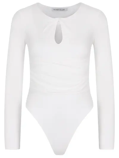 -Боди из вискозного джерси молочного цвета от ROSEVILLE. -Модель облегающего кроя с длинными рукавами, круглым вырезом горловины, вырезом на груди и драпировками, застежкой на две кнопки внизу.
