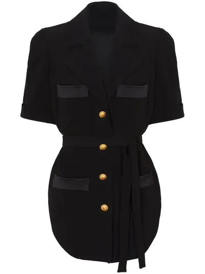 black crepe texture notched lapels V-neck front button fastening logo-embossed buttons front welt pockets short sleeves turn-up cuffs belted waist straight hem
