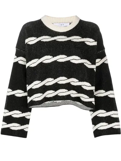 black/white knitted construction patterned intarsia knit crew neck drop shoulder long wide sleeves cropped straight hem