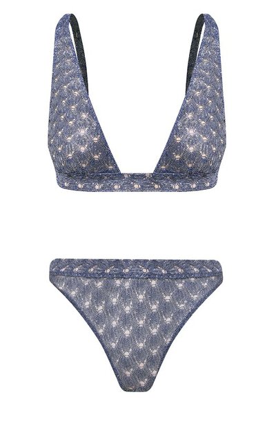 Синий раздельный купальник с нежным ажурным узором выполнили из легкой вискозной пряжи. Шелковистый материал не вытягивается со временем и не выцветает под яркими лучами солнца. Бра с мягкими треугольными чашечками и плавки с широким поясом эффектно мерцают волокнами серебристого люрекса, включенного в состав нити.
