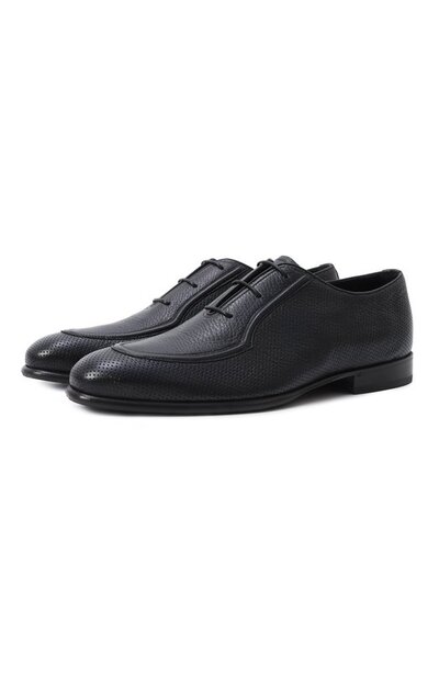 Сплошная мелкая перфорация на оксфордах из мягкой матовой кожи гарантирует эффективную циркуляцию воздуха. Крупнозернистая вставка на миндалевидном мысе, язычке и шнуровке создает игру фактур, а рельефный прошитый кант подчеркивает границу между материалами. Все детали окрашены в темно-синий цвет, поэтому туфли выглядят строго.