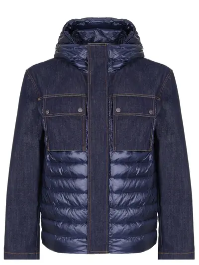 -Синий комбинированный пуховик из стеганой плащевки и денима от ADD.