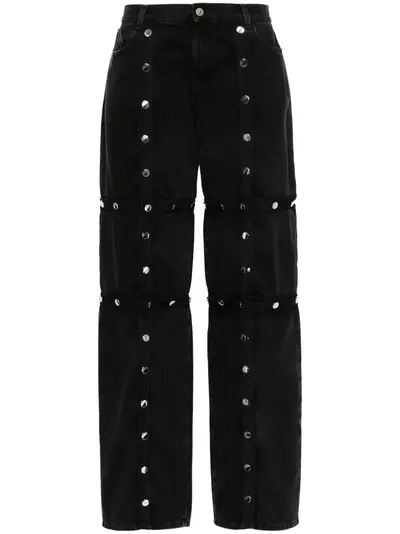 black cotton denim deconstructed design metal snaps low-rise classic five pockets belt loops concealed fly and button fastening wide leg