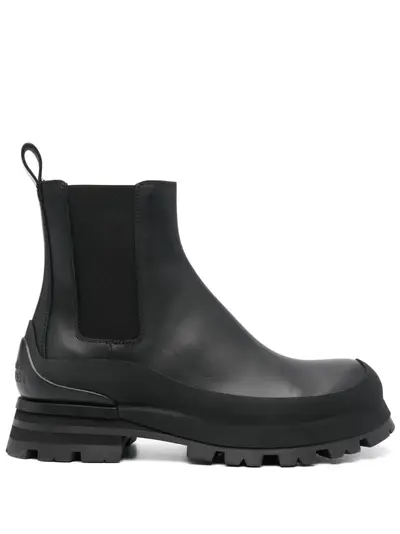 black calf leather smooth grain embossed logo to the rear round toe elasticated side panels slip-on style pull-tab at the heel branded insole rubber lug sole