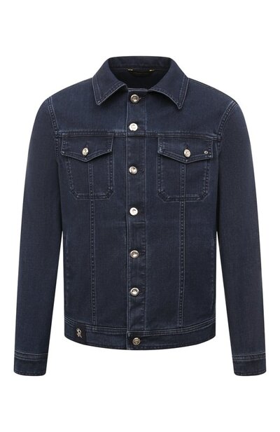 Темно-синяя джинсовая куртка выглядит лаконично, поэтому сможет поддержать повседневный образ в разной палитре. Для изготовления модели со слегка выбеленными швами выбрали мягкий плотный материал на основе хлопка. В состав включили стрейчевые волокна, чтобы изделие удобнее садилось по фигуре. Застежка button fly перекликается с миниатюрной заклепкой в виде эмблемы, которой дополнили левый нагрудный карман. Пояс украсили нашивкой с монограммой SR.