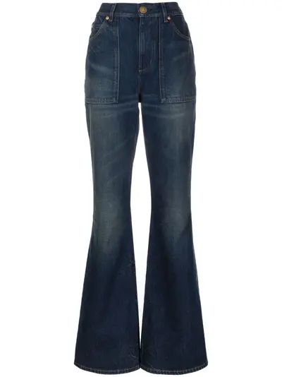 indigo blue cotton denim dark wash logo patch to the rear high waist belt loops concealed fly and button fastening classic five pockets flared
